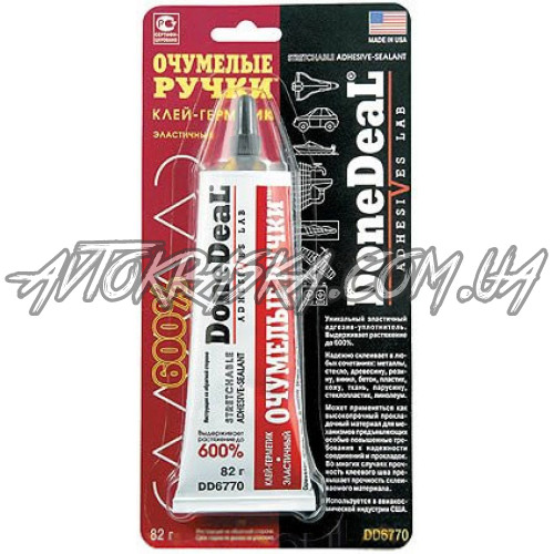 «Очумілі ручки» DD6770 (82 г) — унікальний водостійкий поліуретановий клей-герметик. Витримує розтягування до 600%. Надійно склеює в будь-яких комбінаціях: метали, скло, дерево, гуму, вініл, бетон, пластик, шкіру, тканину, парусину, склопластик, лінолеум. Може використовуватися як високоміцний прокладковий матеріал для механізмів, що пред'являють підвищені вимоги до надійності з'єднань і прокладок.
