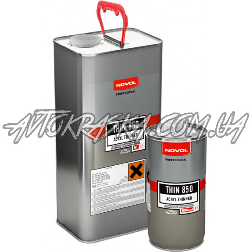 Розчинник акриловий NOVOL THIN 850 (стандартний) – суміш органічних розчинників, яка застосовується для розведення всіх ґрунтів та акрилових лаків. Випускається в трьох версіях: швидкій, стандартній та повільній, що дозволяє підібрати час випаровування до температури роботи та обсягу ремонту.