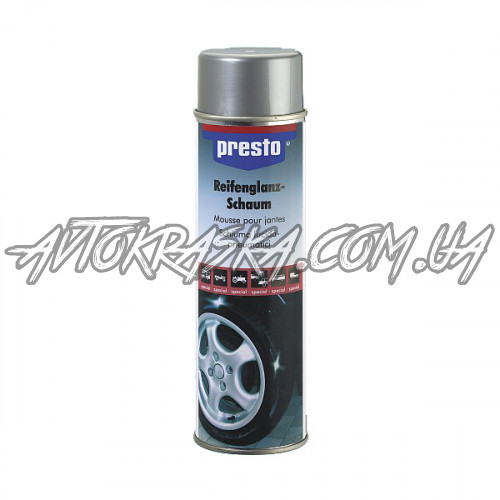 Presto очищувач шин пінний 500 мл — це багатоцільовий очищувач. Легко видаляє пил, бруд, жир і нікотин. Швидко сохне і залишає приємний запах. Використовується для очищення автомобільних сидінь, покриттів, дверей, вікон і дзеркал. У побутовому застосуванні очищає поверхні зі скла, хрому, пластику, підходить для догляду за екраном телевізора та монітора комп'ютера, жалюзі, велосипедів та багатьох інших предметів. Використовується при температурі навколишнього середовища від +15 до +20ºС.