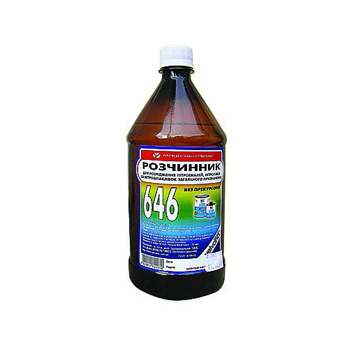 Розчинник 646 "Велвана" 0,7 л є сумішшю летючих органічних рідин: ароматичних вуглеводнів, кетонів, спиртів, ефірів, призначений для розбавлення нітроцелюлозних лакофарбових матеріалів. Розчинники 646 Velvana - це безбарвна або злегка жовтувата однорідна прозора рідина без видимих зважених частинок, що володіє високою розчинювальною здатністю щодо лакофарбових матеріалів, швидко випаровується, не залишаючи запаху.