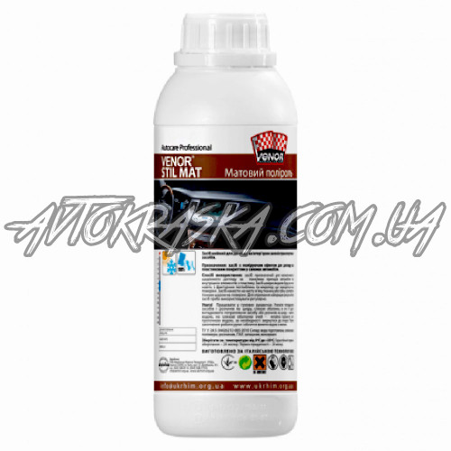 Поліроль для пластика матовий поліроль VENOR STIL 1л - швидкодіюча матова поліроль, що повертає початковий блиск усім пластиковим, вініловим і резиновим елементам обробки салону автомобіля, створюючи на поверхні стійкий антистатичний шар, що відштовхує пил і бруд.
